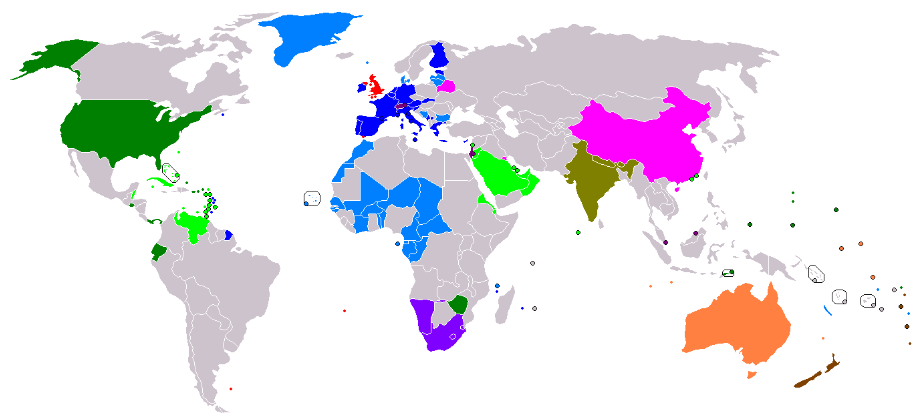 Legend: dark blue - EUR users; dark green - USD users; light blue - EUR pegs; light green - USD pegs (including cascaded like Macao->HK->USD); orange - AUD users; brown - NZD users; lila - ZAR users; yellow - INR users and pegs; red - GBP users and pegs; light pink - XDR/other currency basket pegs; dark pink - two-country usage/peg, multiple cases (CHF in Liechtenstein, ILS in PNA, Singapore/Brunei)