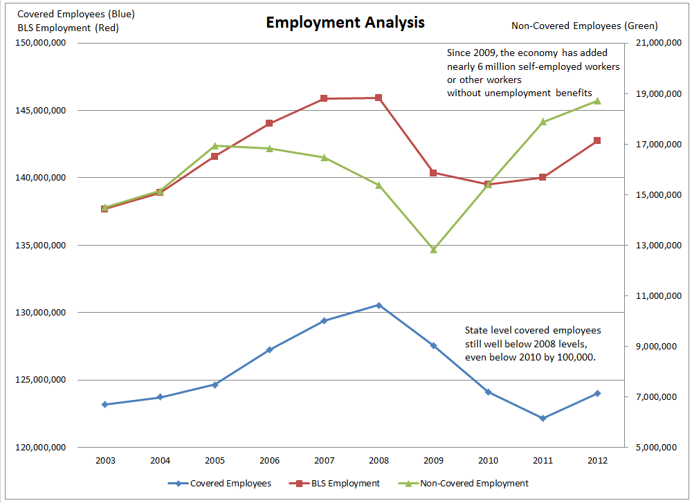 Notice the widening gap between covered employment and employment as reported by the BLS. In 2008 and again in 2010 the difference between BLS employment and Covered Employment as noted by the green line (right axis) was about 15 million.